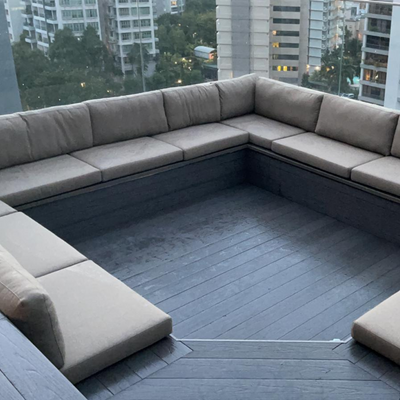 Outdoor decking is made of WPC (wood plastic composite material stronger than PVC), will not splinter and crack, making it safe for children. The aluminum structure is suitable for outdoor spaces and withstand harsh weather. Heat resistant: highly suitable for outdoor spaces and withstand harsh weather.